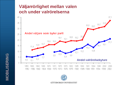 Under nästan femton år var det inte ens särskilt sant. Under 1990-talet ökade inte rörligheten i väljarkåren särskilt mycket utan hängde stabilt strax över 30 procent. Vi fick ändå höra att väljarna blev allt rörligare. Först i samband med valet 2006 ökade andelen partibytare till 37 procent.