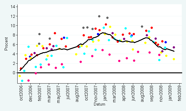 Dagens figur visar opinionsgapet i procentenheter mellan v-s-mp och c-fp-kd-m för sju olika institut sedan september 2006. Med reservation för att hustrun anser mig färgblind har jag använt följande färger för instituten: blå=scb/psu; gul=sifo; lila=novus; röd=synovate; rosa=skop; ljusblå=demoskop; grå=sentio. Alla mätningar väger lika i analysen. Den svarta linjen är en lokalt viktad trendlinje som tar hänsyn till i tiden närliggande mätningar. Denna trend är det enda som är intressant när det gäller att följa kampen mellan blocken i svensk politik just nu.