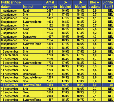 TABELL Blockavstånd i publicerade opinionsmätningar 1-17 september 2006.