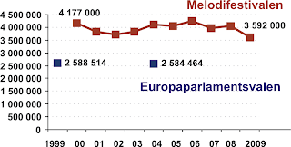 Riksdagsvalen i Sverige tronar fortfarande som det i särklass största kollektiva evenemanget. Sist deltog fem och en halv miljon svenskar i riksdagsvalet. På andra plats hamnar melodifestivalen. Tittarsiffrorna för melodifestivalens final minskade i år men överstiger alltjämt antalet röstande i svenska Europaparlamentsval. Jag förväntar mig inte några omkastningar av ordningen i juni. Men kanske ett minskat gap?
