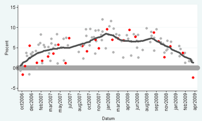 Kommentar till figuren: Figuren visar opinionsavståndet mellan Allianspartierna och oppositionen sedan september 2006. Den grå linjen markerar nollpunkten (likaläge). De röda mätningarna är Demoskops mätningar sedan valet. De kännetecknas av relativt små urval och korta mätperioder. För mer info om statistiken hänvisas till tidigare blogginlägg.