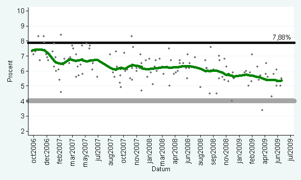 Kommentar: Prickarna i figuren representerar alla mätningar av Centerpartiets röststöd under perioden september 2006-juni 2009. Den grå linjen representerar fyraprocentspärren. Den svarta linjen representerar Centerpartietsvalresultat 2006. Den gröna linjen visar Centerpartiets opinionsutveckling under perioden (lowess-smoothing; bandbredd 0,13).
