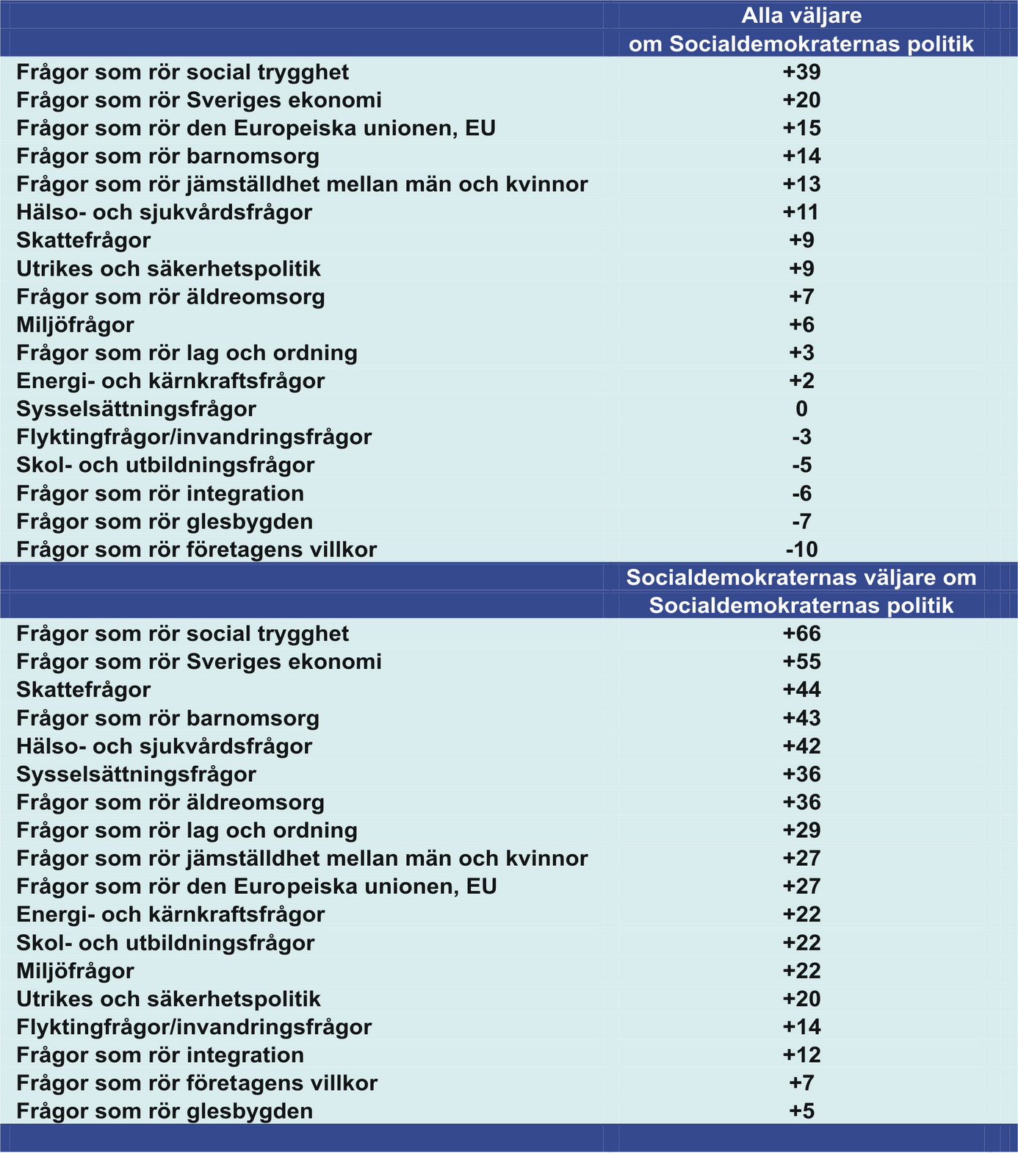 Trygghet och ekonomi (balansmått +39 och +20) uppfattas som socialdemokraternas styrkeområden, enligt de svenska väljarna. Bedömningen delas av socialdemokraternas egna väljare som har samma två områden i topp (+66 resp +55).