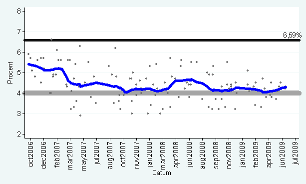 Kristdemokraterna har legat klart under sitt valresultat (6,6 procent) sedan riksdagsvalet 2006. Det nuvarande likaläget mellan Alliansen och oppositionspartierna är största hotet mot regeringen Reinfeldt just nu att Kristdemokraterna inte klarar att komma över fyraprocentspärren till riksdagen. KDs snitt har under mandatperioden aldrig nått under fyra procent enligt min poll of polls, men det har varit snubblande nära (se diagram).