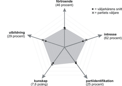 Kd-väljarna skiljer ut sig som något bättre utbildade (29 procent med högskoleutbildning), klart mer politiskt intresserade (62 procent) och något mer politiskt kunniga än valmanskåren som helhet (7,6 poäng).