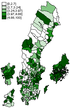 Färgerna på Sverigekartan nedan illustrerar Miljöpartiets röststöd i Sveriges kommuner i samband med riksdagsvalet 2006. Kommunerna delades in i fem likstora grupper efter partiets procentandel i riksdagsvalet. Vita områden visar t ex de tjugo procent kommuner där MP hade lägst röststöd (0-2,7 procent).