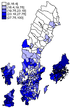 Färgerna på Sverigekartan nedan illustrerar Moderaternas röststöd i Sveriges kommuner i samband med riksdagsvalet 2006. Kommunerna delades in i fem likstora grupper efter partiets procentandel i riksdagsvalet. Vita områden visar t ex de tjugo procent kommuner där M hade lägst röststöd 2006 (0-16,4 procent).