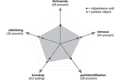 Moderaternas väljare är något mer politiskt intresserade än snittväljaren (64 procent). Graden av partiidentifikation ligger nära snittet (28 procent), liksom förtroendet för politiker (49 procent). De politiska kunskaperna bland moderaternas väljare är något bättre än valmanskåren (8,0 poäng).