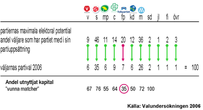 För de stora riksdagspartierna S och M gick det bättre. De lyckades utnyttja 76 respektive 72 procent av allt sympatikapital och hamnade alltså närmare sitt maximala tak än andra partier.