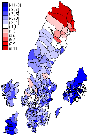Problembeskrivningen är delvis rätt. De socialdemokratiska valvindarna blåste snålt i hela landet men framför allt i storstäderna. På kartan nedan visas förändringarna av socialdemokraternas röststöd i riksdagsvalet mellan 2002 och 2006. Ju blåare färg desto större S-väljarförluster. Ju rödare färg desto större väljarvinster (jo, socialdemokraterna gick framåt i en del kommuner i norr och i delar av Jämtland fast där bor inte så många väljare).