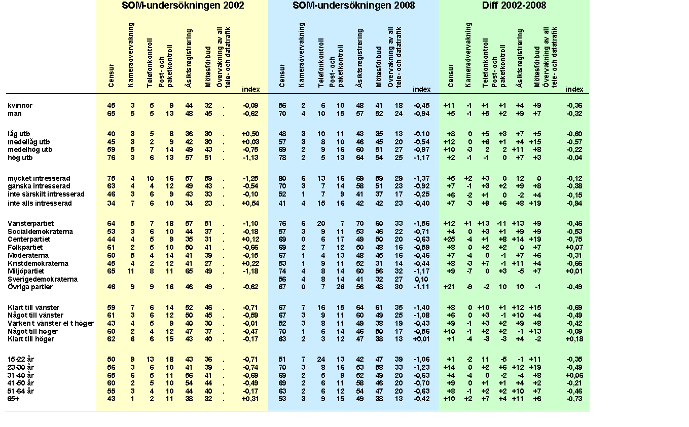 Genomsnittet för ett sammanfattande additivt index för de sex jämförbara indikatorerna presenteras också. Indexet går mellan -6 (negativa attityder till tvångsmedel) och +6 (positiva attityder till tvångsmedel). Minussiffror i den gröna index-kolumnen skvallrar alltså om att attityderna blivit mer negativa till statlig användning av olika tvångsmedel när den nationella säkerheten är hotad (kanske inte det mest pedagogiska sättet att redovisa, men ändå).