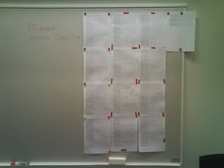 Tvåhundratrettioåtta löften från Alliansens gemensamma manifest inför valet 2006 är (i likhet med tusentals andra vallöften från andra valrörelser) nu snyggt och prydligt kodade och listade med hjälp av textanalysverktyget Atlas.ti. Jag kommer att tillbringa ett stort antal forskardagar i november tillsammans med kollegorna Nicklas Håkansson och Elin Naurin i Statsvetenskapliga institutionens nya faciliteter för lagforskning. (Vem sa att samhällsvetenskaplig forskning nödvändigtvis behöver genomföras i ensamhet?) Just nu pryder Allianslöftena från 2006 whiteboardtavlan som referens i det fortsatta kodningsarbetet.