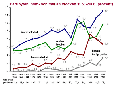 Man måste samtidigt komma ihåg att huvuddelen av de väljare som byter parti mellan valen byter inte mellan blocken utan inom blocken. I närtid har två tredjedelar av alla partibyten varit inomblocksbyten, det vill säga byten mellan partier inom s-blocket (röd linje) eller byten mellan partier inom b-blocket (blå linje).