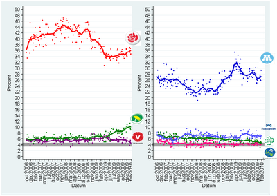 8. Hej Carl!Min bedömning byggd på vad vi vet om institutens metoder är att tillvägagångssätten är tillräckligt lika (SCB, Sifo, Demoskop, Novus och Synovate) för att en sammanvägning skall kunna ge en god bild av det aktuella opinionsläget. (SKOP ställer t ex en annan fråga än de andra, så de är inte med i den mätningarnas mätning som jag publicerar här på bloggen, inte heller nätmätarna United Minds eller Sentio som använder andra metoder).Sen kan man förstås ha tusentals invändningar mot prognosmetoderna i sig själv. Du har rätt i att \”Skit in ger skit ut\”. Om man som du tror att opinionsinstituten ger en missvisande bild av opinionsläget så är sammanvägningen förstås inte till någon större hjälp. För alla oss andra som värderar institutens metoder högre än du är det värdefullt att kunna höja blicken från enskilda mätningar. Viktigt förstås, precis som du säger, att också jämföra institutens mätserier över tid individuellt. På Ekots hemsida finns för övrigt alla mätningar från alla institut sedan 2000 samlade.Jämförelse: Om man tror att 4 tunga aktier på börsen har felaktig värdering kan man inte lita på SAX-index heller?I internationell jämförelse är svenska opinionsinstitut träffsäkra, åtminstone historiskt.