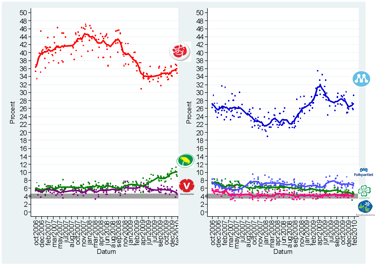8. Hej Carl!Min bedömning byggd på vad vi vet om institutens metoder är att tillvägagångssätten är tillräckligt lika (SCB, Sifo, Demoskop, Novus och Synovate) för att en sammanvägning skall kunna ge en god bild av det aktuella opinionsläget. (SKOP ställer t ex en annan fråga än de andra, så de är inte med i den mätningarnas mätning som jag publicerar här på bloggen, inte heller nätmätarna United Minds eller Sentio som använder andra metoder).Sen kan man förstås ha tusentals invändningar mot prognosmetoderna i sig själv. Du har rätt i att \”Skit in ger skit ut\”. Om man som du tror att opinionsinstituten ger en missvisande bild av opinionsläget så är sammanvägningen förstås inte till någon större hjälp. För alla oss andra som värderar institutens metoder högre än du är det värdefullt att kunna höja blicken från enskilda mätningar. Viktigt förstås, precis som du säger, att också jämföra institutens mätserier över tid individuellt. På Ekots hemsida finns för övrigt alla mätningar från alla institut sedan 2000 samlade.Jämförelse: Om man tror att 4 tunga aktier på börsen har felaktig värdering kan man inte lita på SAX-index heller?I internationell jämförelse är svenska opinionsinstitut träffsäkra, åtminstone historiskt.
