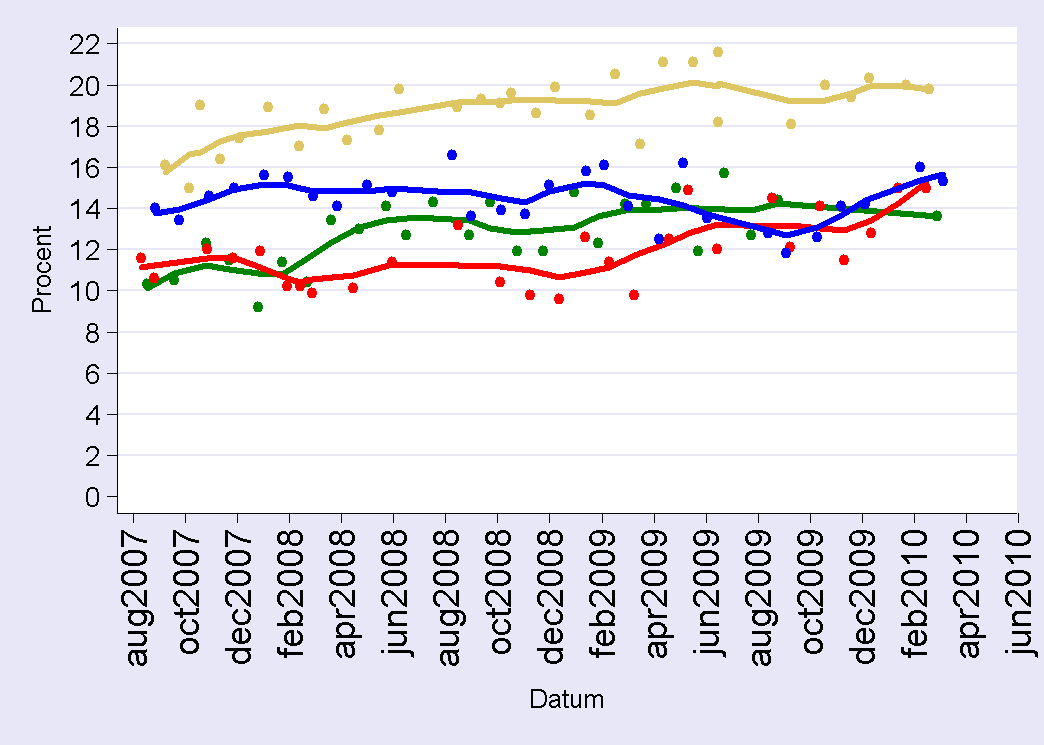 Figur: Andel ”vet ej/vill ej svara” i fyra opinionsinstituts mätningar av väljaropinionen (Sand=Synovate; Blå=Sifo; Röd=Novus; Grön=Demoskop)