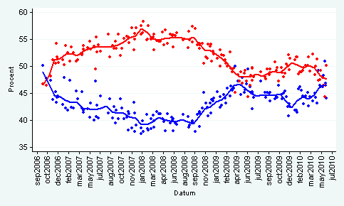 Glöm inte bort att drygt 32% av alla tillfrågade av någon anledning inte gav svar på frågan angående vilket parti man skulle rösta på om det var val idag. Det gör att de 9000 tillfrågade blir drygt 6000, en radikal minskning. Och är det inte så mr Oscarsson att statistiska mätningar med så stor bortfall är värdelösa? Rätta mig gärna om jag har fel.