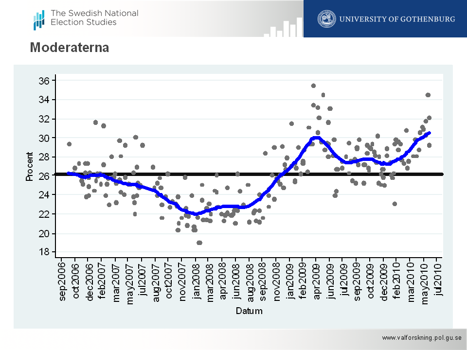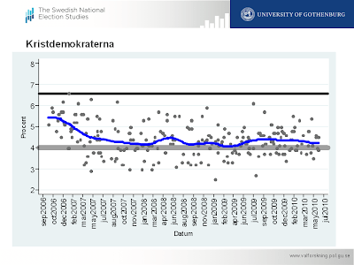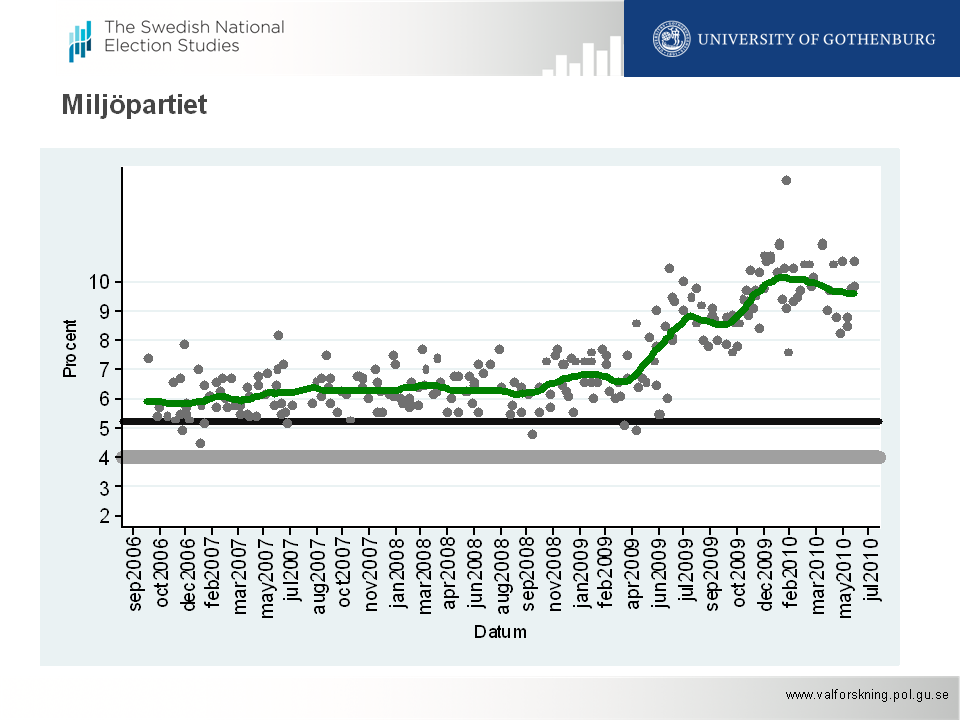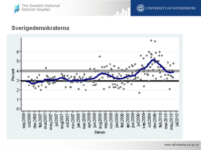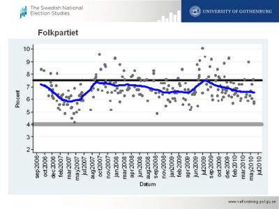 På allmän begäran: Poll of polls för hela mandatperioden och för alla partier. Svart streck=partiets valresultat 2006. Grått streck: Fyraprocentspärren.