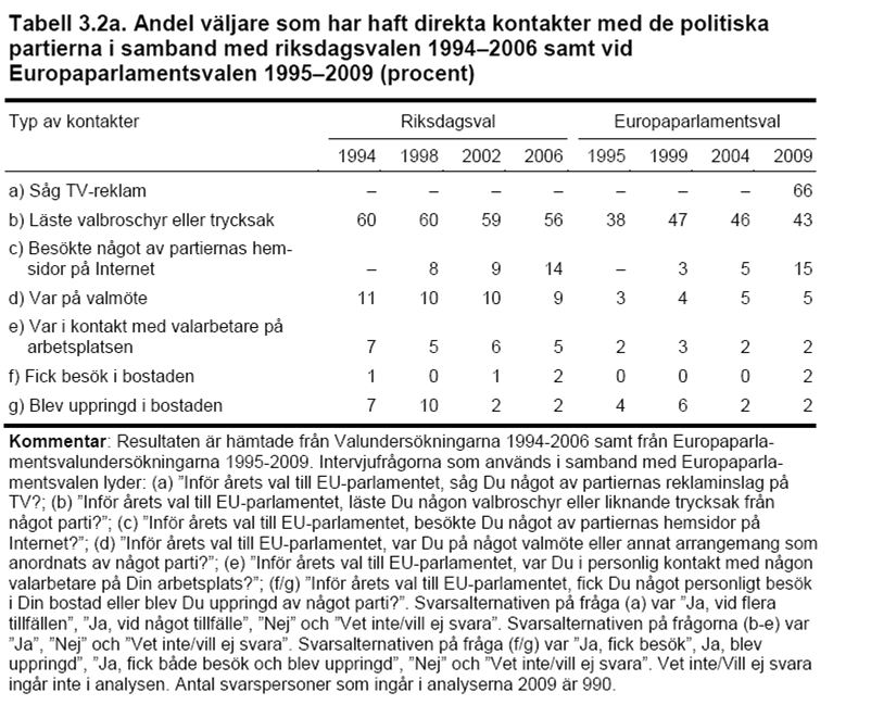 Det betyder att TV-reklam blev den i särklass vanligaste direktkontakten med partierna inför Europaparlamentsvalet. Resultatet är inte särskilt märkliga med tanke på svenska folkets medievanor. Genomsnittstittandetpå TV per dag och person är hela 96 minuter (Nordicom: Sveriges mediebarometer 2008). Folkpartiets 30-sekundare med toppkandidaten Marit Paulsen utanför sin husvagn tillhörde de mest sedda. Tjugosex procent av väljarna uppgav att de sett TV-sänd reklam från Folkpartiet. Moderaternas reklam sågs av var femte väljare (20 procent) och Kristdemokraternasreklaminslag av ungefär lika många (17 procent).