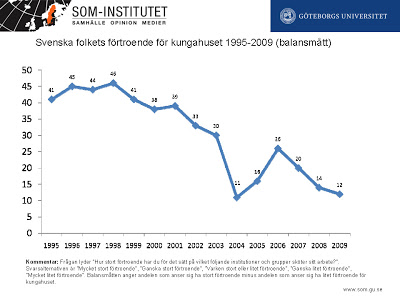 Som aptitretare visar jag Nilssons sammanställning av utvecklingen av svenska folkets förtroende för kungahuset. Sedan 1995 har förtroendet för kungahuset minskat tydligt. Siffrorna i figuren är balansmått, vilket betyder att det fortfarande hösten 2009 fanns en positiv opinionsövervikt (+12) vilket betyder att andelen som uppger att de har ganska eller mycket stort förtroende för kungahuset är tolv procentenheter större än andelen som har ganska eller mycket litet förtroende för kungahuset.