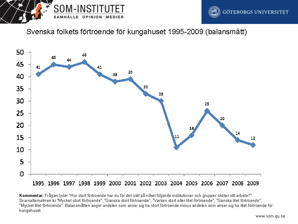 Som aptitretare visar jag Nilssons sammanställning av utvecklingen av svenska folkets förtroende för kungahuset. Sedan 1995 har förtroendet för kungahuset minskat tydligt. Siffrorna i figuren är balansmått, vilket betyder att det fortfarande hösten 2009 fanns en positiv opinionsövervikt (+12) vilket betyder att andelen som uppger att de har ganska eller mycket stort förtroende för kungahuset är tolv procentenheter större än andelen som har ganska eller mycket litet förtroende för kungahuset.