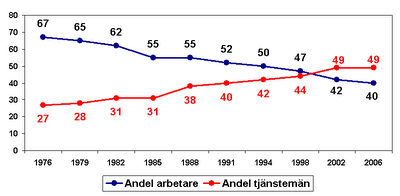 Andel av socialdemokraternas väljare som är arbetare (blå linje) respektive tjänstemän (röd linje) vid riksdagsvalen 1976-2006 (procent).