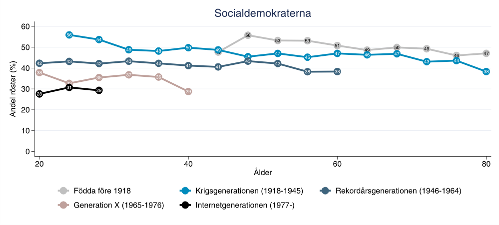 Andel röstande på Socialdemokraterna i fem olika generationer väljare 1956-2006 (procent).