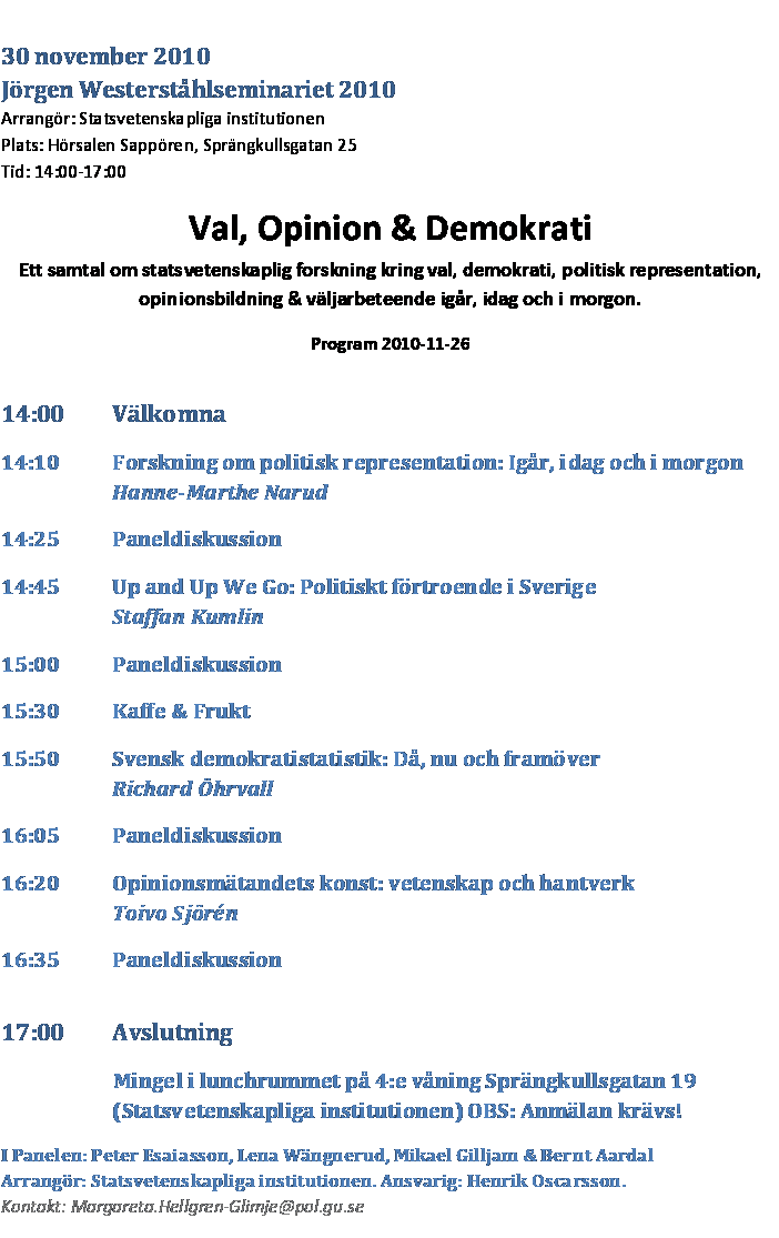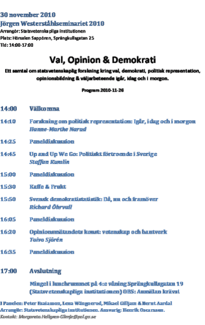 Den 30 november är det som vanligt dags att bevista det årligen återkommande Jörgen Westerståhl-seminariet vid Statsvetenskapliga institutionen i Göteborg. Alla hälsas välkomna till ett underhållande samtal kring den statsvetenskapliga forskningen om val, demokrati, politisk representation, opinionsbildning och väljarbeteende: forskningsområden där professor emeritus Sören Holmberg varit verksam sedan mitten av 1960-talet. Under tre intensiva timmar kommer fyra inledare (Toivo Sjörén, Richard Öhrvall, Staffan Kumlin och Hanne-Marthe Narud) och fyra panelister (Bernt Aardal, Peter Esaiasson, Lena Wängnerud och Mikael Gilljam) att vägleda oss i ett samtal om trender, utvecklingslinjer och framtidsscenarier. Välkomna!