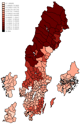 Vargjakten har knappt inletts men det är snart redan färdigskjutet. Jag roade mig med att skapa en Sverigekarta över svenskarnas fritidsvanor när det gäller jakt. I SOM-undersökningarna förekommer ”jagat” som en av de fritidssysselsättningar som omfrågas. Slår man samman information från flera nationella SOM-undersökningar erhåller man ett tillräckligt statistiskt underlag för att undersöka andelen svenskar i varje kommun som uppger att de jagat vid något tillfälle under de senaste tolv månaderna (för de riktigt små kommunerna när underlaget blir alldeles för tunt (n<40) imputeras istället länsmedeltalet). Resultatet blir en karta som visar var i Sverige de personer bor som någon gång ägnar sig åt fritidssysselsättningen att jaga.
