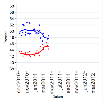 Det stundande omvalet till Västra Götalandregionen den 15 maj innebär bland mycket annat att jag behöver uppdatera mig om läget i opinionen. Nedan presenteras mandatperiodens första sammanställning av opinionsmätningar, poll of polls. Sedan riksdagsvalet i september 2011 har vi sett mycket små förändringar. I jämförelse med motsvarande period efter Allianssegern i valet 2006 har opinionsvintern 2010-11 varit närmast händelselös, vilket sannolikt hänger samman med att vi inte haft någon organiserad opposition i Sverige.