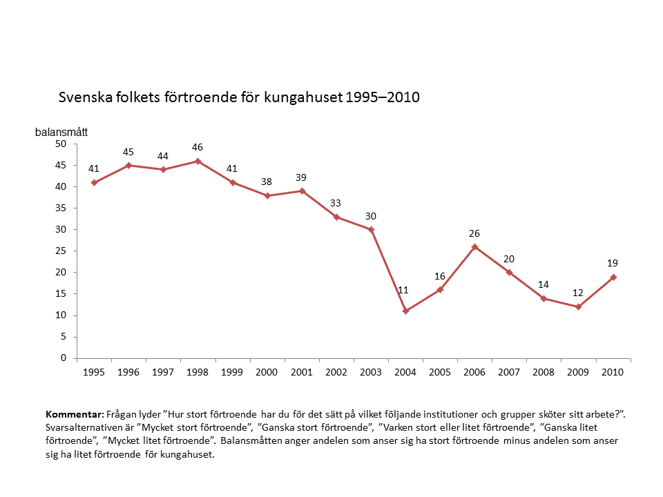 Prinsessbröllopet sommaren 2010 innebar ett trendbrott för förtroendet för kungahuset. Förtroendesiffran för hösten 2010 hade dock blivit ännu starkare för kungahuset om det inte hade varit för publiceringen av ”Den ofrivillige monarken”. För fler detaljer om hur publiceringen påverkade förtroendenivåerna, följ länkarna ovan!