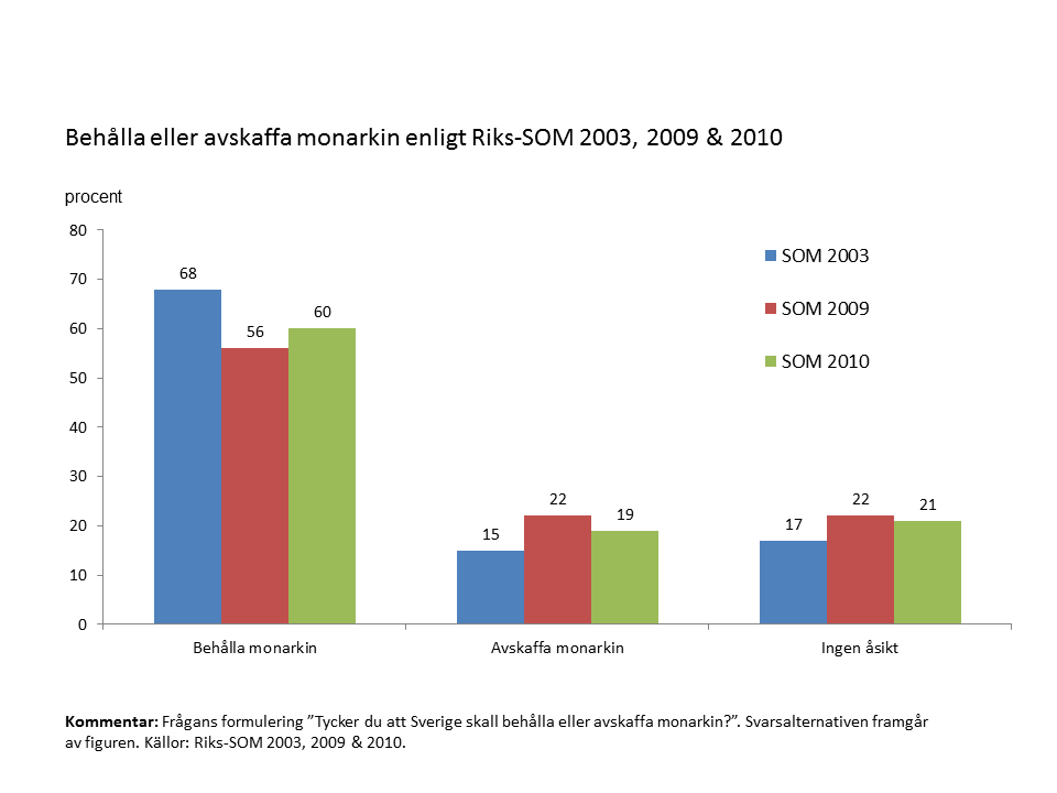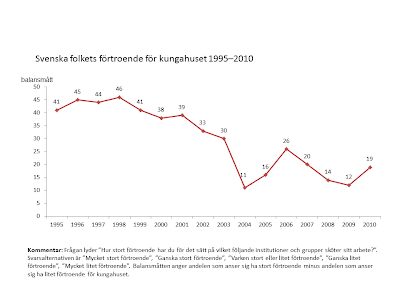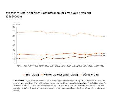 Därför vill jag gärna påminna bloggläsarna om SOM-institutets kontinuerliga mätningar av förtroendet för kungahuset, svenska folkets inställning till att införa republik och stödet för monarkin. Några av tidsserierna finns inklippta här. Vill man veta mera finns fler bilder presenterade på SOM-institutets hemsida och den som vill kan själv se och höra Lennart Nilssons anförande på årets SOM-seminarium.