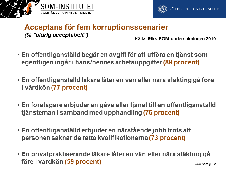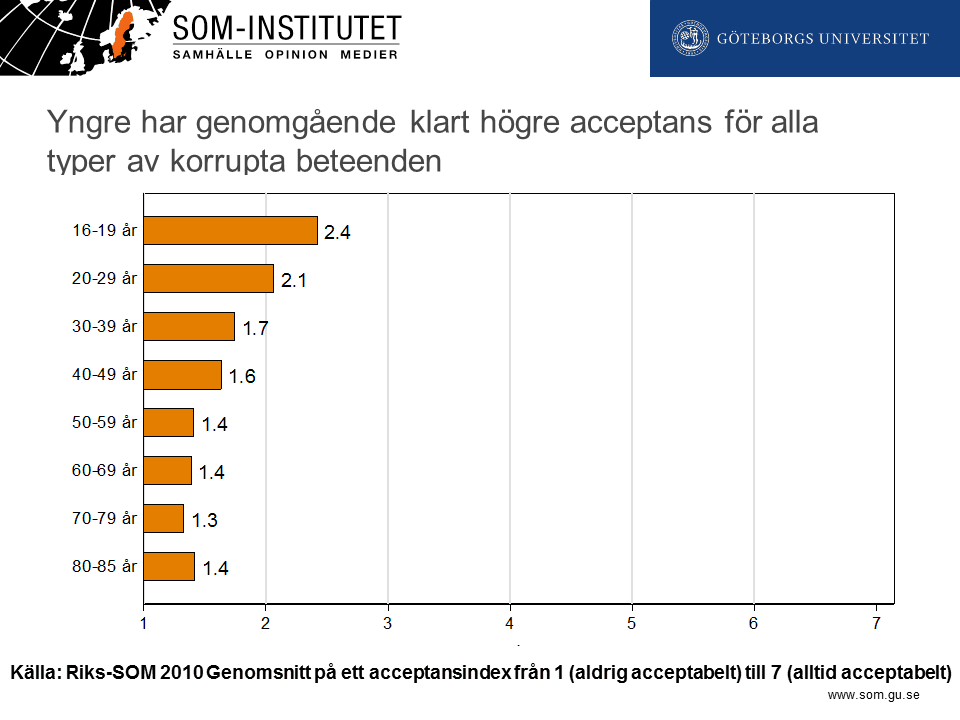 I min och Monika Bauhrs bokkapitel ”Svenska folkets syn på korruption” presenteras resultaten från SOM-institutets mätningar av svenska folkets acceptans för olika korrupta beteenden. hittade vi ett intressant samband mellan ålder och acceptans för olika former av korruption. De fem scenariorna uppfattades alla som klart oacceptabla. Andelen som uppfattar dem som ”aldrig acceptabelt” varierar med mellan 89 procent (offentliganställd begär en avgift) till 59 procent (privatpraktiserande läkare låter en vän eller släkting gå före i vårdkön).