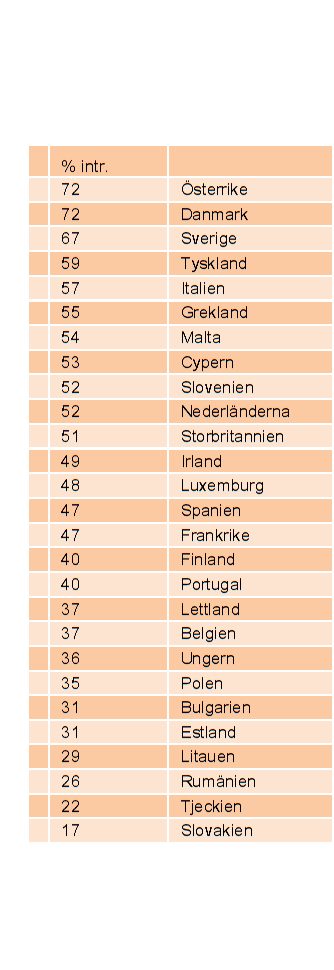 På tio i botten-listan är nio av tio länder nya medlemsländer från forna öst. Av de nordiska EU-länderna skiljer de finska ungdomarna ut sig som varande avsevärt mindre intresserade av politik (37 procent) än svenska (67 procent) och danska (72 procent) ungdomar.