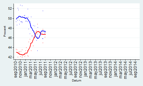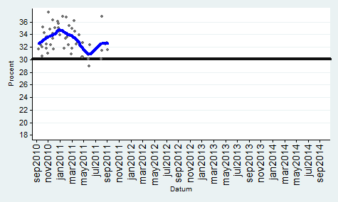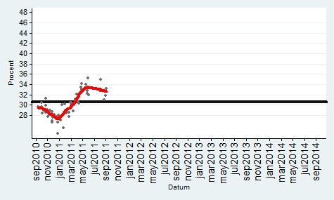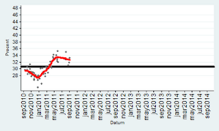 Diagrammen visar att vi knappast behöver hetsa upp oss alltför mycket över partiernas öde i väljaropinionen på väldigt väldigt länge. Det är ohyggligt långt kvar på innevarande mandatperiod. Mycket vatten kommer att hinna rinna under broarna innan väljarna finner anledning att på allvar uppdatera sina partipreferenser. Det ger tid för partierna att ägna sig åt sina kärnverksamheter: att utveckla nya idéer och ideologier som har relevans för svenska folkets livsvillkor, oro, drömmar och visioner under den senare hälften av 2010-talet.