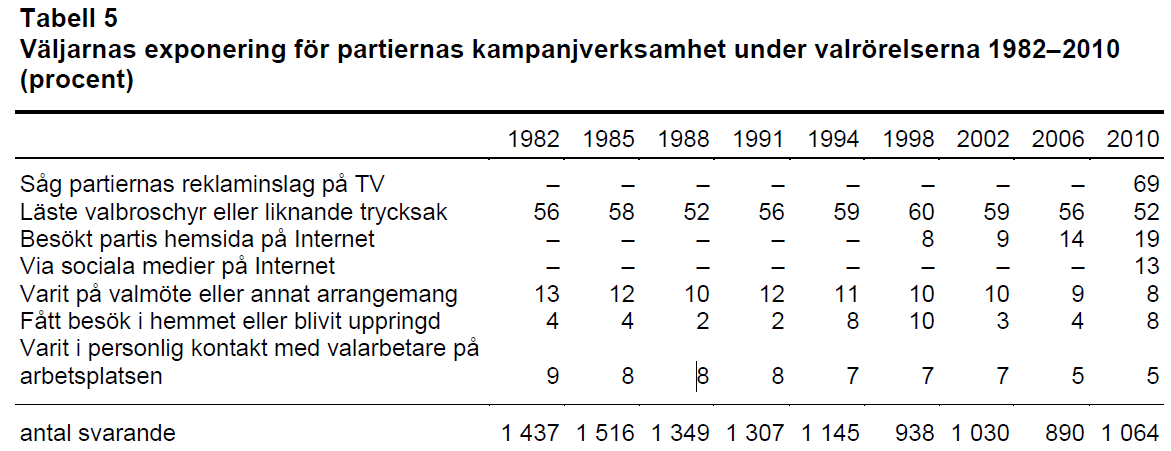 Valundersökningarnas värdefulla tidsserier visar att de former av kontakter som bjuder störst interaktivitet, i viss mån valmöten men framför allt telefonsamtal, hembesök och arbetsplatsbesök faktiskt aldrig har varit särskilt vanliga i svenska valrörelser. Personliga kontakter och valmötesbesök befinner sig dock i klar nedgång under de senaste tjugo åren: andel väljare som besökt valmöte i samband med valrörelsen har minskat från 13 procent 1982 till 8 procent 2010. Och andelen väljare som blivit uppvaktad på sin arbetsplats av en valarbetare har minskat från 9 till 5 procent under samma period.