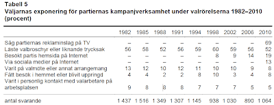 TV-reklam blev väljarnas i särklass vanligaste direktkontakt med partierna i samband med valrörelsen 2010, långt vanligare än att läsa valbroschyrer (52 procent), besöka partiernas hemsidor (19 procent) eller kontakter via sociala medier på Internet (13 procent), enligt Valundersökningen 2010.