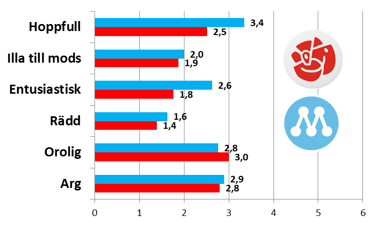Partierna tycks inte väcka särskilt intensiva känslor hos svenska väljare under valrörelsen. Det är genomgående låga medeltal på våra känsloskalor. Socialdemokraterna väckte starkast känslor när det gäller ”orolig” (medeltal 3,00) och Moderaterna starkast känslor för ”hoppfullhet” (3,35). Socialdemokraterna väckte oro och Moderaterna hopp bland väljarna i 2010 års valrörelse. Resultaten visar också att Moderaterna gjorde väljarna mer rädda och illa till mods än vad Socialdemokraternas gjorde, medan Moderaterna gav upphov till starkare känslor av entusiasm än Socialdemokraterna (2,63 jämfört med 1,75).