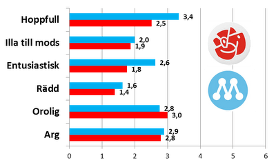 Frågor om vilka känslor kandidater och partier genererar hos väljare har därför blivit vanligare i nationella valundersökningar runt om i världen. I 2010 års svenska valundersökning valde vi att inkludera för första gången en fråga om ”… olika känslor som politiska partier kan ge upphov till”. Av utrymmesskäl begränsades våra känslomätningar till de två största partierna, Socialdemokraterna och Moderaterna (men alla partier och ledare finns mätta i vår E-panel och publiceras här på bloggen under våren 2012). Vi har valt använt en elvagradig intensitetsskala från 0 (”inte alls”) till 10 (”i mycket stor utsträckning”). De sex känslorna är tänkta att fånga in de tre dimensioner som i opinionsforskningen identifierats som viktigaste känslorna i analyser av opinionsbildning: ilska, oro och entusiasm.