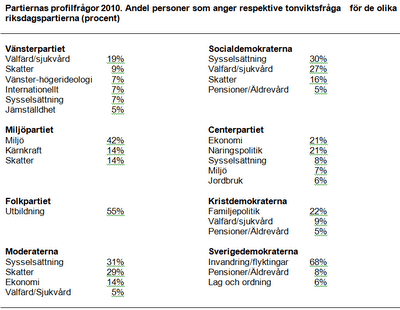 I tabellen nedan redovisas för varje parti de kategorier av svar som samlat mer än fem procent av alla väljare. Procentandelarna visar hur stor andel av samtliga respondenter som nämnt respektive område som något partiet lagt särskild tonvikt vid. Vi lär oss till exempel att Folkpartiet associeras mycket tydligt till ett enda område (55 procent nämner ”utbildning” som något FP lade vikt vid i 2010 års val). Sverigedemokraternas profil domineras helt av flyktingar/invandring (68 procent). Och fyrtiotvå procent av väljarna nämnde spontant ”miljö” när de fick frågan om vad MP lagt tonvikt vid.