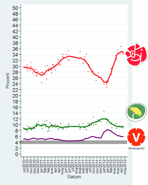 Vi har under de senaste fyra månaderna bevittnat den snabbaste opinionsförändringen för ett enskilt parti (räknat i procentenheter). Socialdemokraterna har ökat sitt opinionsstöd med någonstans mellan tio och tolv procentenheter från den 27 januari till idag den 1 maj. Bottennoteringarna kring 24 procent i januari har förbytts mot en nivå närmare fem procentenheter starkare än förra valresultatet (30,7 procent). Omkring 35 procent av väljarna uppger idag att de skulle rösta på Socialdemokraterna om det vore riksdagsval idag (vilket det ju inte är).
