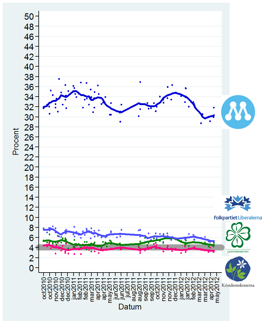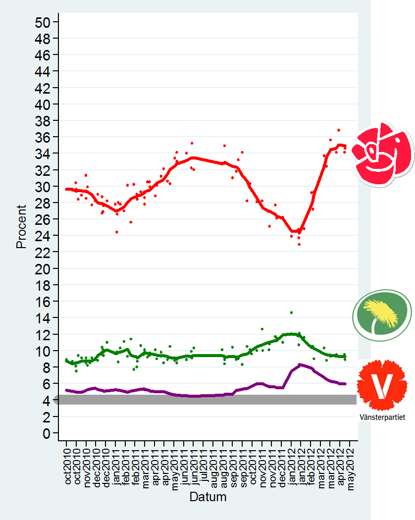 Vi har under de senaste fyra månaderna bevittnat den snabbaste opinionsförändringen för ett enskilt parti (räknat i procentenheter). Socialdemokraterna har ökat sitt opinionsstöd med någonstans mellan tio och tolv procentenheter från den 27 januari till idag den 1 maj. Bottennoteringarna kring 24 procent i januari har förbytts mot en nivå närmare fem procentenheter starkare än förra valresultatet (30,7 procent). Omkring 35 procent av väljarna uppger idag att de skulle rösta på Socialdemokraterna om det vore riksdagsval idag (vilket det ju inte är).