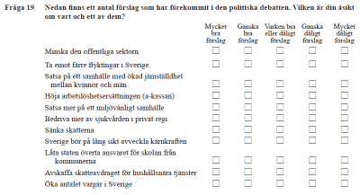 Förslaget om att ta emot färre flyktingar ingår alltid i en lista med liknande förslag hämtade från aktuell svensk samhällsdebatt. Här nedan är ett exempel på hur det kan se ut i våra formulär.