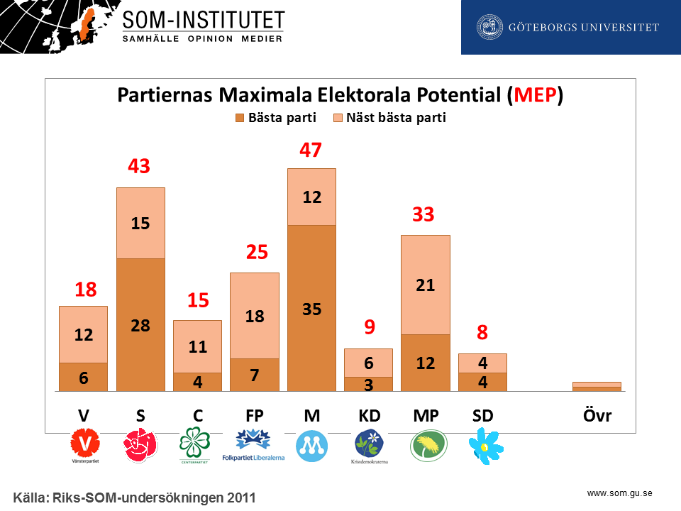 Jag önskar alla läsare av min forskarblogg en skön sommar med en ny Mätningarnas Mätning och några aptitretare från SOM-institutets huvudrapport ”I framtidens skugga”. I figuren nedan presenteras opinionsutvecklingen för Allianspartierna (blått) och för de rödgröna partierna V S MP (rött) under perioden från valet i september 2010 fram till nu. Stor dramatik och stora skiften har vi redan fått uppleva. Med ledning av hur det sett ut under de mandatperioder vi har bakåt oss kan vi förvänta oss fler dramatiska scenförändringar innan vi går in i supervalåret 2014.Ett partis ställning i förstahandsopinionen säger långt ifrån allt om partiets ställning i opinionen. I den dolda väljaropinionen kan partiers opinionsställning förstärkas och försvagas utan att det omedelbart syns i de regelbundna opinionsmätningarna. Ett sätt att få grepp om partiernas samlade sympatikapital är att slå samman partiernas andel av förstapreferenserna med partiernas andel av andrapreferenserna. Då får man en uppfattning om partiernas maximala elektorala potential (MEP), det vill säga ett partis maxtak som visar vilket utrymme det finns att växa ytterligare och hur bra det skulle kunna gå om partiet lyckas växla in andrapreferenser till förstahandsstöd. För små partier är ställningen i andrahandsopinionen en fråga om liv eller död. MEP är därför framför allt intressant att studera för de små partierna.