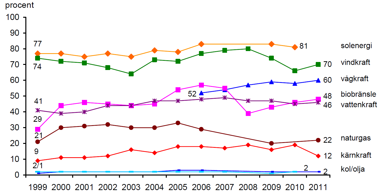 Andra nyheter i vår rapportserie är bland annat rapporterna ”Ungdomar i Skåne” av Sandra Engelbrecht, ”Scenkonst i Västsverige” av Josefine Bové och ”Satsa mer på olika energikällor 1999-2011” av Per Hedberg och Sören Holmberg. Figuren nedan visar andelen svenskar som tycker att vi ska satsa mer än idag på olika energikällor.