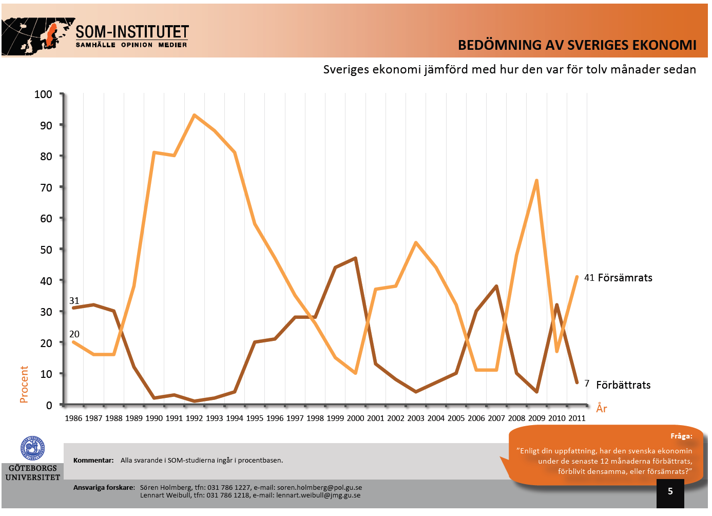 Svenska trender är en sammanställning av SOM-institutets längsta tidsserier. Här hittar du många av de centrala nyckelindikatorerna på samhällsutvecklingen som är betydelsefulla för att öka förståelsen om viktiga förändringar i vårt samhälle. Ett exempel är svenskarnas retrospektiva bedömningar av utvecklingen av den nationella ekonomin (se nedan).