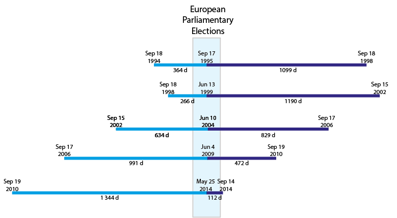 Benämningen ”Supervalåret 2014” är hämtat från tysk politik och vi väljer att använda termen eftersom vi i Sverige kommer att anordna val på alla fyra demokratiska nivåer (EU, Nationell, Regional och Kommunal) så gott som samtidigt, inom loppet av 112 dagar, mellan den 25 maj och 14 september. Grafiken nedan visar tydligt att det handlar om en mycket annorlunda valkontext än vad vi är vana vid. Det blir spännande att se hur partier och medier kommer att hantera situationen. Och för en valforskarprofessor väcks såklart många nya och spännande forskningsfrågor: Blir det en rekordlång intensiv valkampanj? Hur mycket kommer nationella frågor dominera Europaparlamentsvalrörelsen den här gången? Kommer valdeltagandenivåer och valresultat från Europaparlamentsvalet att spilla över till septembervalen?