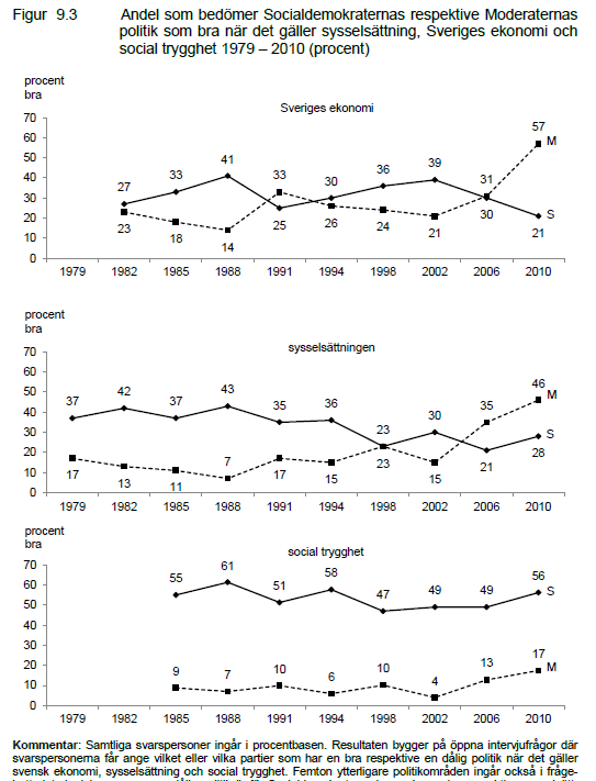 Källa: Resultaten är hämtade från svenska valundersökningar under perioden 1979-2010. Tabellen är hämtad från boken ”Nya svenska väljare” av Henrik Oscarsson och Sören Holmberg. I samma kapitel 9 kan du läsa mer om vilka betyg väljarna ger alla partiers politik på 18 olika sakfrågeområden och vad betygen har för effekter på partivalet.