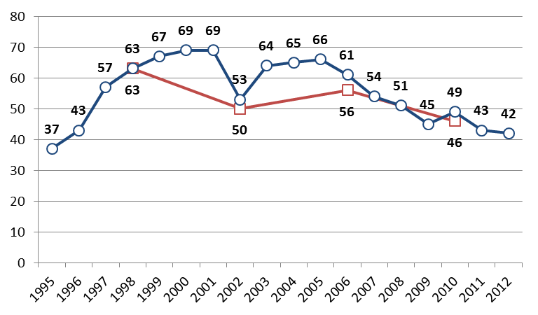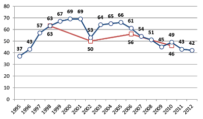 Källa: Svenska valundersökningar 1998-2010. SOM-undersökningar 1995-2012.