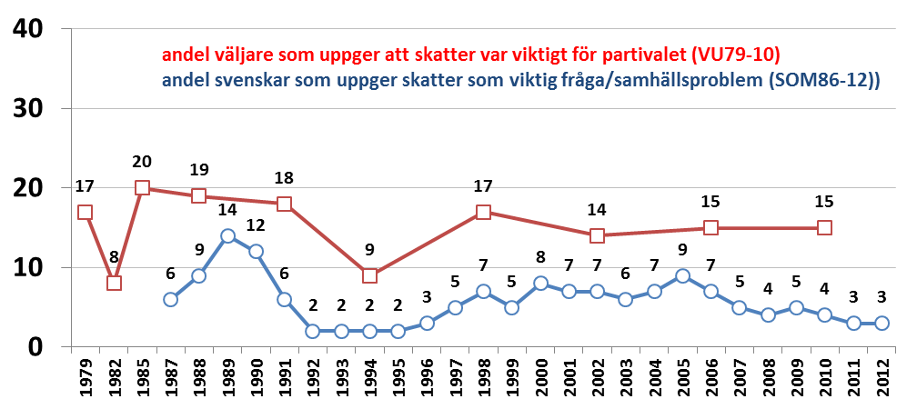 Ett blogginlägg kan inte ge något uttömmande svar på huruvida frågan om ett femte jobbskatteavdrag har potential att bli en valvinnare. Låt oss ta en närmare titt på några evidens. Skattefrågor hamnar sällan särskilt högt på väljarnas dagordning inför ett val. Andelen väljare som i svenska valundersökningar på en helt öppen fråga nämnt ett skäl till partival som handlar om skatter har varierat mellan 8 och 20 procent. Det har bubblat med men sällan nått pallplats. I SOM-undersökningarna när vi frågat om viktiga frågor och samhällsproblem har skatterna hamnat ännu lägre ned på dagordningen. Senaste noteringen är att blott tre procent av befolkningen ger ett svar som kan kategoriseras som ”skatter”.